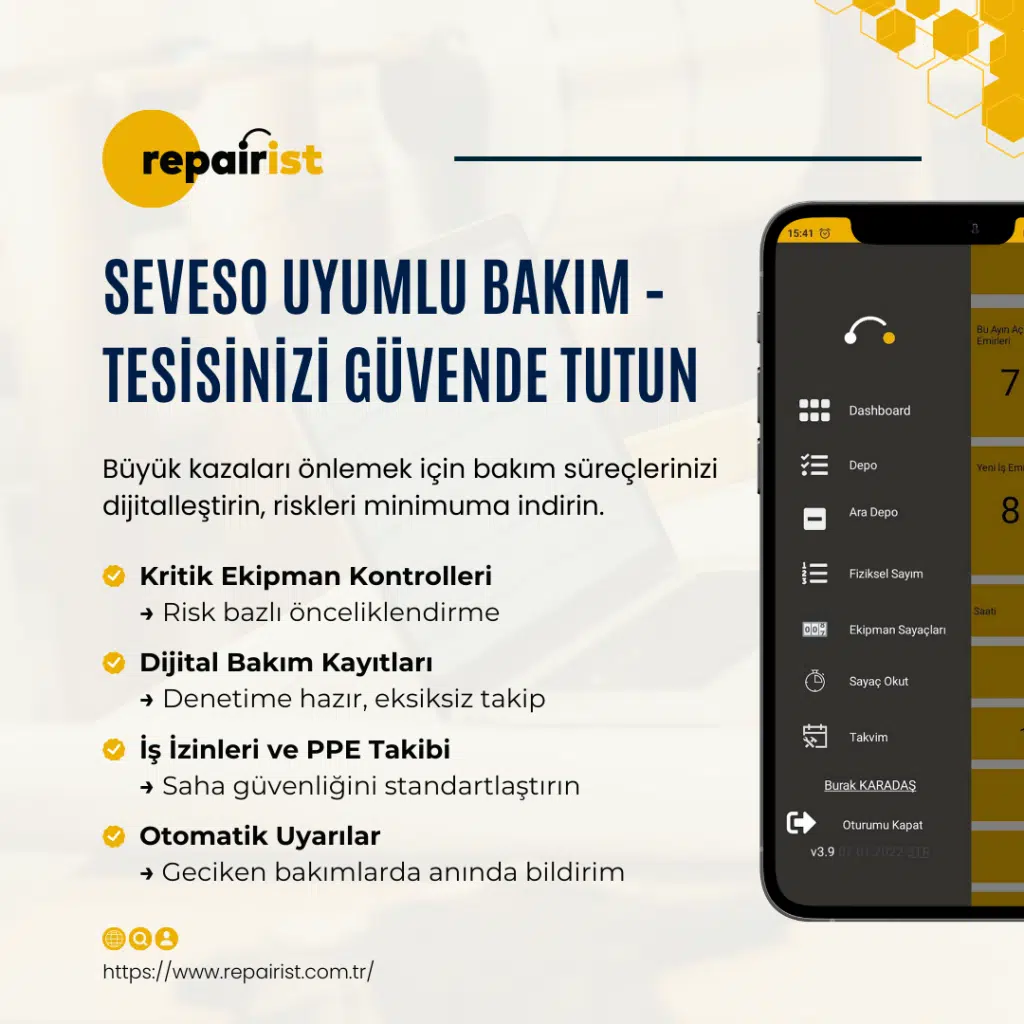 Repairist CMMS, Seveso kapsamında çalışan tesislerde bakım süreçlerini dijitalleştirerek hem güvenliği ve hem de denetime hazırlığı güçlendirir.